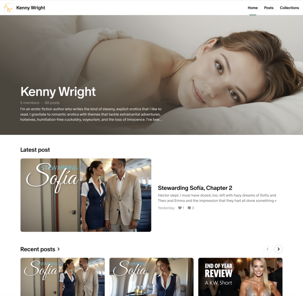 If you’d like to support me beyond buying my books, or are interested in reading stories that haven’t quite made it out to the major publishers, you can still find me on Ream. It’s basically an indie Patreon that’s geared towards authors. I just finished publishing a novella there called Stewarding Sofia, about a sexy flight attendant and her husband.